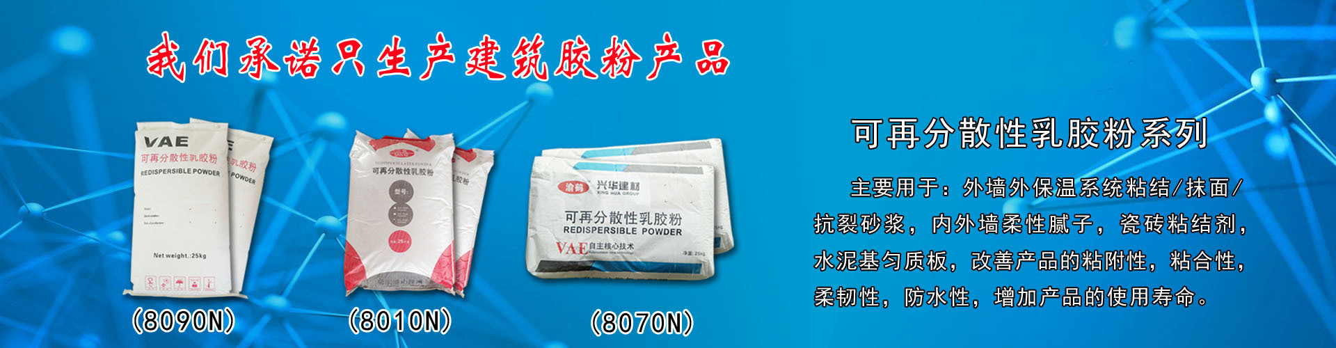 兴华乳胶粉具有:粘附着力强,耐冻,抗老化,防水性好,柔韧性好,拉拔强度超过国际1至2倍。